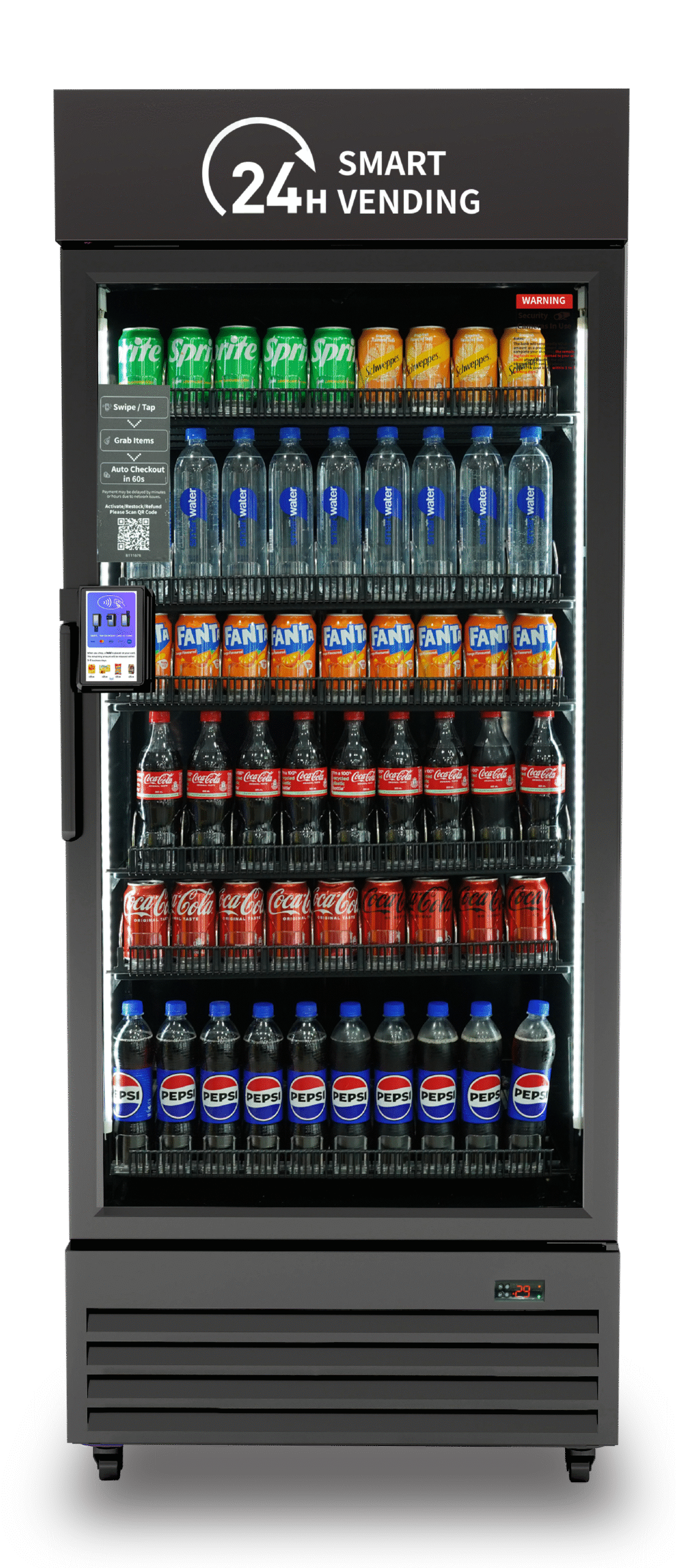 Our open-shelf architecture completely eliminates mechanical jams. You open the fridge door, take the physical item directly from the shelf, and simply walk away. The AI cameras do the rest.